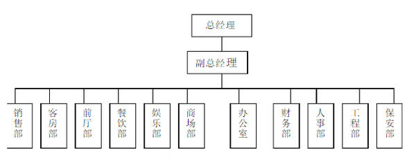 酒店的经营为每日24小时不间断运行,因此酒店的运作机制,分为营业和职能两大部分。新员工入职酒店后,在日常的工作中,将会涉及到与其它部门的协作与配合,因此必须了解酒店的机构设制情况。由于各酒店的规模和经营管理方式有所不同,但基本的部门和机构不会有很大的差别,其主要部门架构如下: